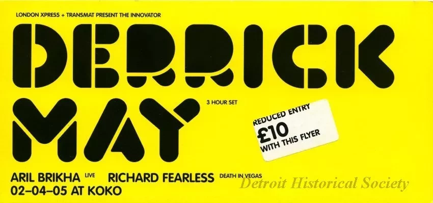 One handbill advertising "Derrick May, 3 Hour Set" at the Koko nightclub in London, England, on 2 April 2005. The handbill is printed in black text on a yellow background. An adhesive label shows "Reduced Entry £10 With This Flyer."