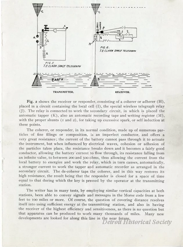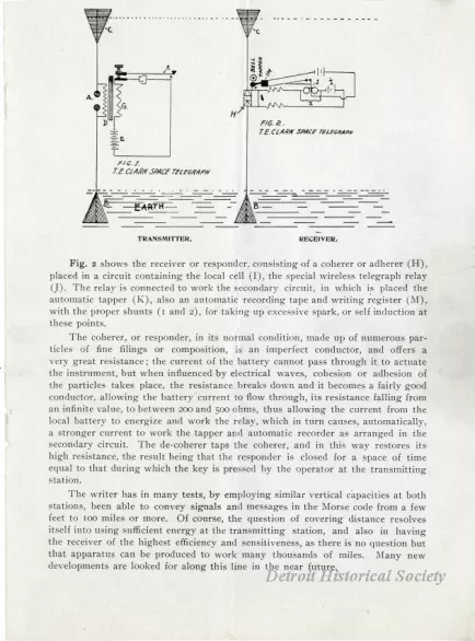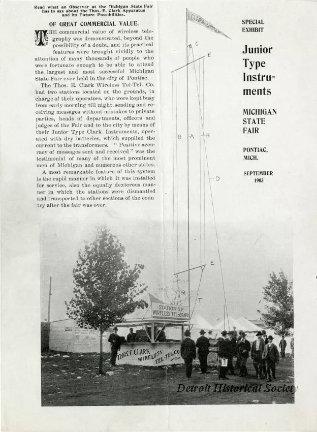 Article about the Thomas E. Clark Wireless Telegraph and Telephone Company's demonstration at the Michigan State Fair in Pontiac in September 1903. The setup consisted of a wireless transmitter which would sent Morse code messages to a receiver. The account is positive and the writer looks forward to further advances in this technology. A photo of one of the booths and towers is on the recto. The verso has circuit diagrams of both the transmitter and receiver. The right edge appears to have staple shaped tears suggesting this was removed from a magazine.