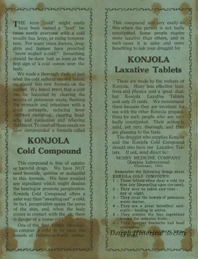 Half folded brochure advertising Konjola Cold Compound and Konjola Laxative Tablets manufactured by the Mosby Medicine Company of Cincinnati, Ohio. The brochure is printed on green paper with the title on the front page, and a blank back page.