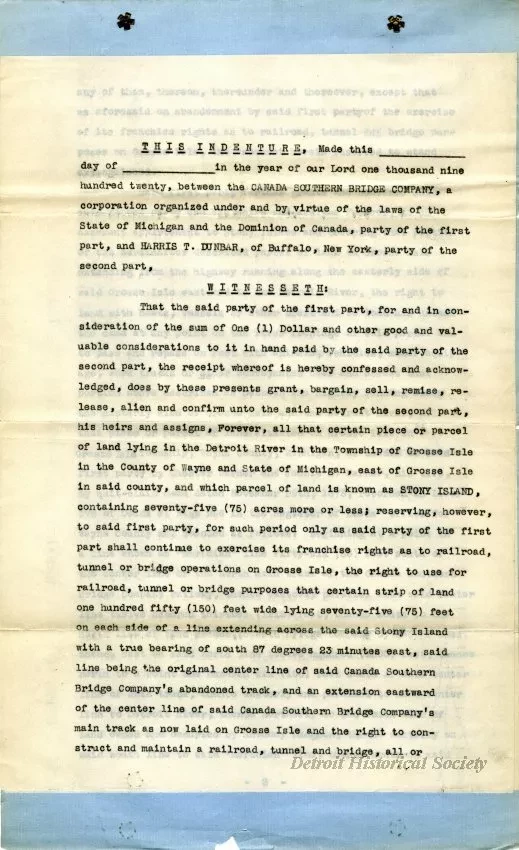 One unsigned indenture, dated 1920, between the Canada Southern Bridge Company of Michigan and Canada, and Harris T. Dunbar of Buffalo, New York. The document consists of four pages of black typewritten text on white paper. The text provided a legal description of Stony Island in the lower Detroit River and indicated that the Bridge Company would sell the island to Harris T. Dunbar for $1.00, but reserved a 150-foot wide strip of land for a future right of way. The two pages were bound together in a legal-style, light blue paper binder which has two brass grommets at the top edge. Typewritten text on the outside of the binder reads "Warranty Deed, Canada Southern Bridge Company to Harris T. Dunbar" and printed text that shows "Miller, Canfield, Paddock & Perry, Attorneys and Counsellors, 1124-1132 Penobscot Building, Detroit, Michigan."