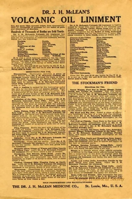 Large quarter folded sheet of directions for Dr. J.H. McLean's Volcanic Oil Liniment, manufactured by the Dr. J.H. McLean Medicine Company of St. Louis, Missouri. Separate directions are provided for a varied of ailments for both humans and livestock. The other panels of the sheet contain the directions translated into Spanish, Italian, Bohemian (Czech), Polish, Norwegian/Danish (printed in a blackletter typeface), French and Swedish.