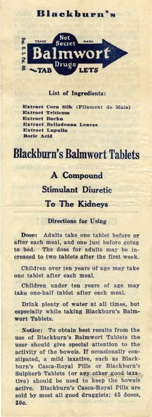 Half folded directions for using Blackburn's Balmwort Tablets, "a compound stimulant diuretic to the kidneys." Also included are advertisements for other medicines from the Blackburn Products Company of Dayton, Ohio, including Blackburn's Su-thol Tablets, Blackburn's CascaRoyal-Pills, and instructions for making cough syrup from Concentrated Essence Mentho-Laxene.