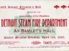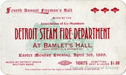 Invitation card to the Fourth Annual Fireman's Ball held by the Association of Ex-Members Detroit Steam Fire Department at Bamlet's Hall on Grand River Avenue and Rowland Street, on Monday, April 3, 1899, printed in red on white. The Detroit Grays Military Band are listed as the entertainment. A green illustration of a horse-drawn fire engine serves as the background. The ticket price is listed as $1.