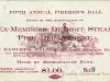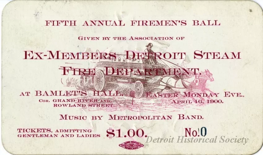 Invitation card to the Fifth Annual Fireman's Ball held by the Association of Ex-Members Detroit Steam Fire Department at Bamlet's Hall on Grand River Avenue and Rowland Street, on Monday, April 16, 1900, printed in red on white. The Metropolitan Band are listed as the entertainment. A brown and red illustration of a horse-drawn fire engine serves as the background. The ticket price is listed as $1. "No. 0" is printed in the lower right corner. It has been embossed with a seal consisting of a loop of fire hose encircling a ladder, and a crossed hook, ax, and bugles, beneath a fire helmet.
