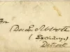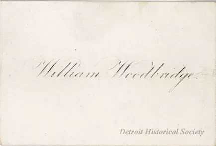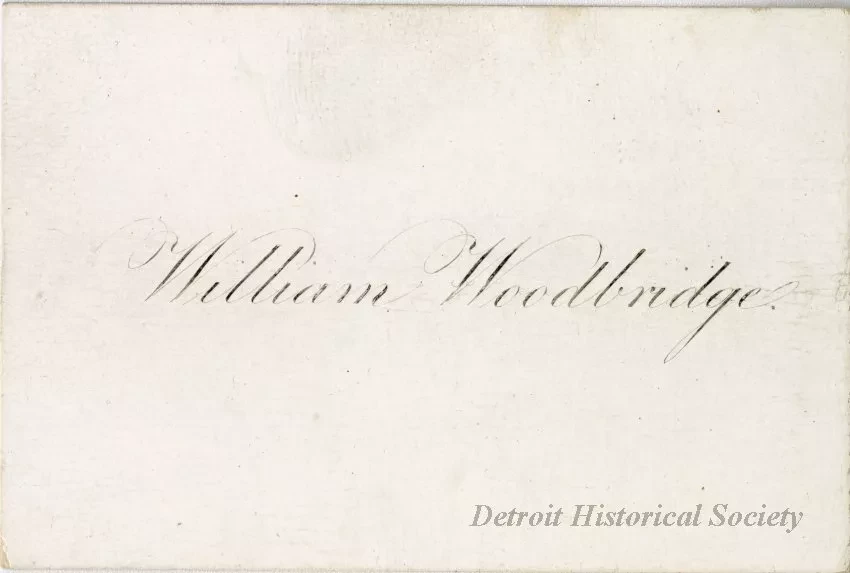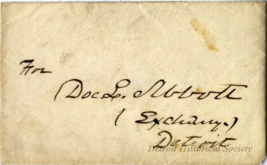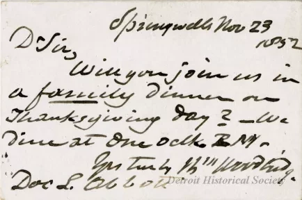 Envelope and invitation to a Thanksgiving dinner written and sent by William Woodbridge to Dr. L. Abbot of Detroit. The invitation is handwritten on the verso of William Woodbridge's calling card. The note reads: