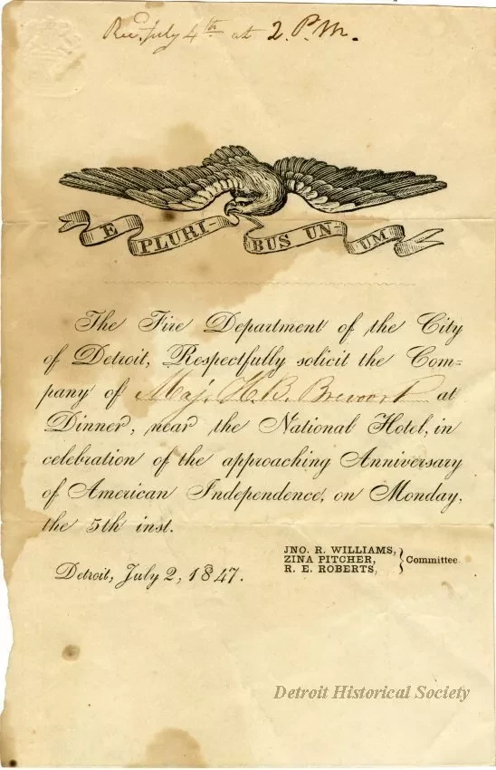 The Fire Department of the City of Detroit, Respectfully solicit the Company of Maj. H.B. Brevoort at Dinner, near the National Hotel, in celebration of the approaching Anniversary of American Independence, on Monday the 5th inst.