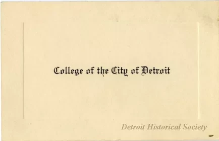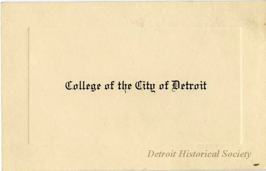 Invitation card printed on beige paper with "College of the City of Detroit" in a black letter typeface inside within an embossed border. "Graduation Day Pass--Masonic Auditorium--Jun, 1929," is handwritten on the verso in blue ink, however the matching invitation is dated 1933.