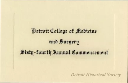Invitation card printed on beige paper with "Detroit College of Medicine and Surgery, Sixty-Fourth Annual Commencement" in a black letter typeface inside within an embossed border.