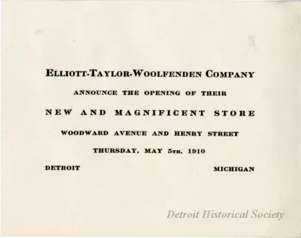 Invitation card to the opening of the Elliott-Taylor-Woolfenden Company's "New and Magnificent Store" at Woodward Avenue and Henry Street on May 5, 1910.