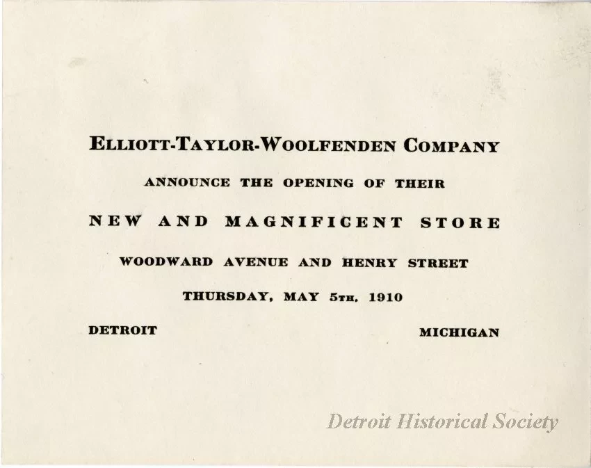 Request ImageInvitation card to the opening of the Elliott-Taylor-Woolfenden Company's "New and Magnificent Store" at Woodward Avenue and Henry Street on May 5, 1910.