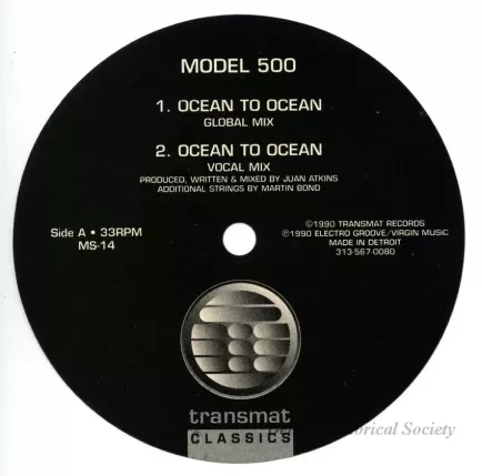 One record label for "Model 500, Ocean to Ocean" as recorded in a "Global Mix" version and a "Vocal Mix" version. The music was "Produced & Mixed by Juan Atkins; Additional Strings by Martin Bond." The label is printed in white and gray text on a black background. The label text indicates "Side A, 33 RPM" and "©1990, Transmat Records."