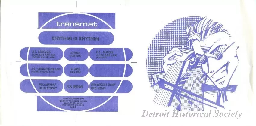 One set of record labels for "Transmat, Rhythim Is Rhythim." The left label is printed in white and silver text on a light blue background and shows "A1. Strings, A2. Strings of Life, B1. Kaos" as well as "Side A, Side B, 33 RPM" and "©1987, Transmat Records." The music was "Produced By Mayday." The right label shows a head and shoulders caricature of a man playing a cello.