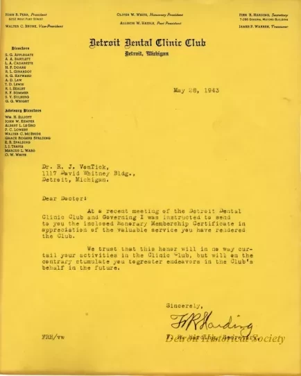 Typewritten letter sent by F.R. Harding, secretary of the Detroit Dental Clinic Club to Dr. Rudolph J. Von Tick on May 28, 1943, which was included with an Honorary Membership Certificate, in appreciation of past service. Harding closes the letter expressing the club's desire that Von Tick continues in "greater endeavors in the Club's behalf in the future." The letter is printed on yellow letter head, which lists the Detroit Dental Club's officers, directors, and advisory directors.