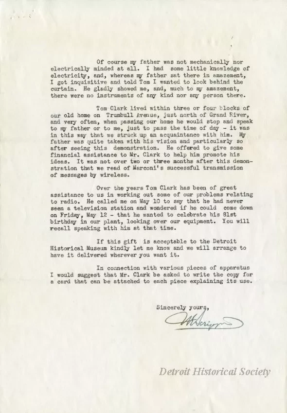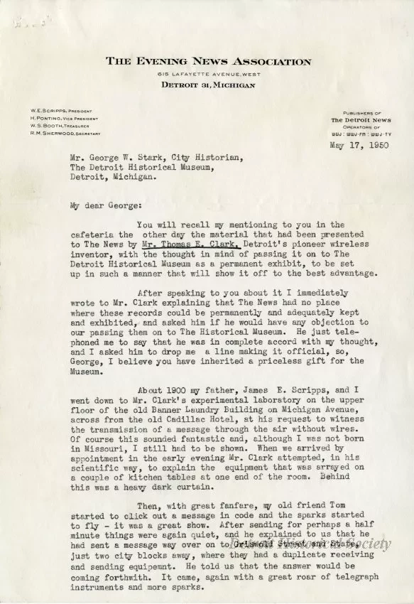 Two page typewritten letter from William Edmund Scripps of the Evening News Association to George W. Stark of the Detroit Historical Museum dated May 17, 1950 offering some of Thomas E. Clark's equipment which he gifted to the Detroit News to the Detroit Historical Museum. Scripps also recalls in detail a visit he paid to Clark's laboratory in the Banner Laundry Building around 1900 with his father James E. Scripps during which Clark demonstrated his wireless telegraph system by sending messages between his lab and another site at Griswold Street and State Street. He also discusses Clark's visit several days prior to the WWJ-TV station for his 81st birthday. The letter closes with Scripps' signature.