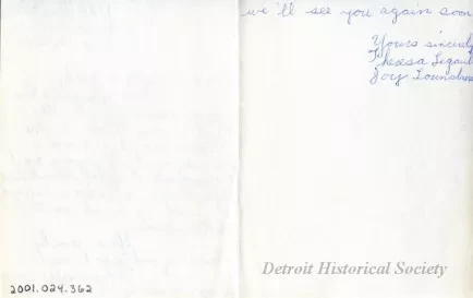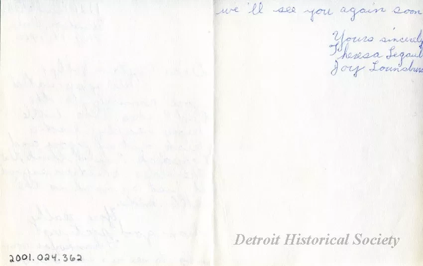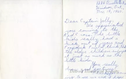 One handwritten letter, dated November 14, 1960, from Theresa Legault and Joy Lounsbury to Captain Jolly (Toby David) to thank him for visiting Red Cross School in Windsor, Ontario. The girls said that they believe both the young and older children enjoyed his visit and that he drew pictures well. They finished by saying they hope they are able to see him again soon.