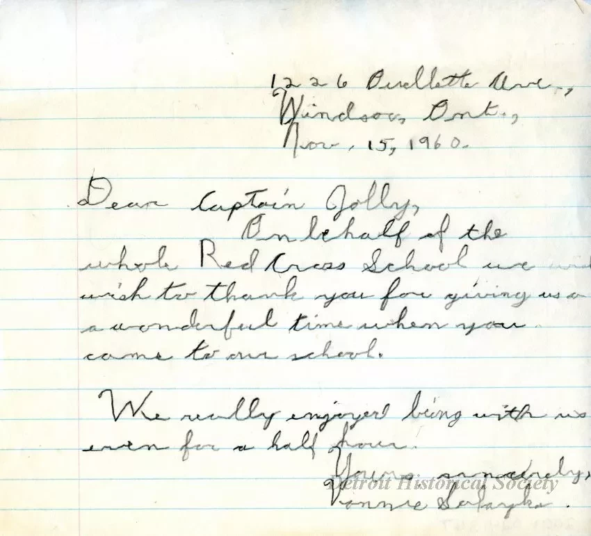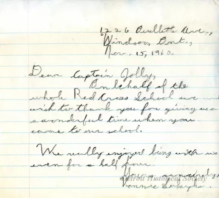 One handwritten letter, dated November 15, 1960, addressed from Vonnie Solayka to Captain Jolly (Toby David) to thank him for visiting the Red Cross School in Windsor, Ontario. Vonnie stated that the children really enjoyed him coming, even if it was only for a half hour.