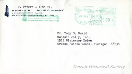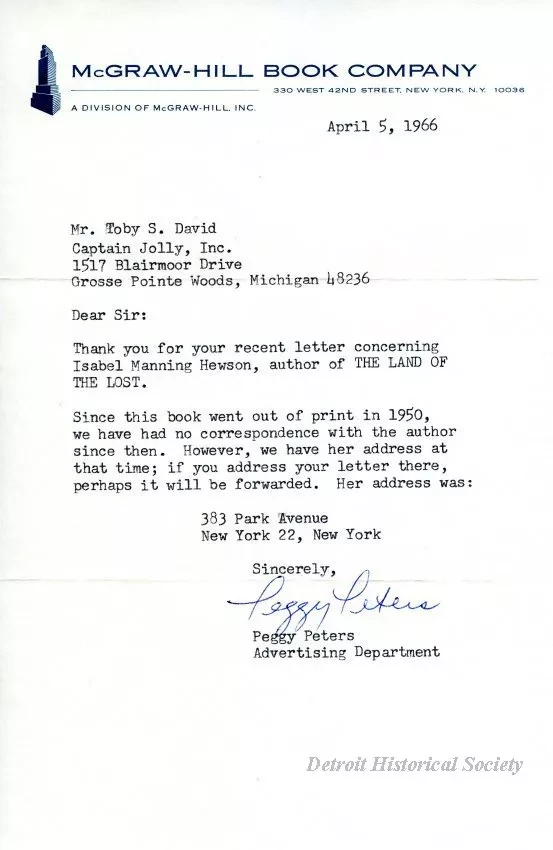 One typewritten letter, dated April 5, 1966, and envelope from Peggy Peters of McGraw-Hill to Toby David. Peters thanked David for his recent letter regarding Isabel Manning Hewson who wrote the book, "The Land of the Lost." She said that McGraw-Hill has not had contact with Hewson since the book went out of print in 1950, but offered him her address from that time.