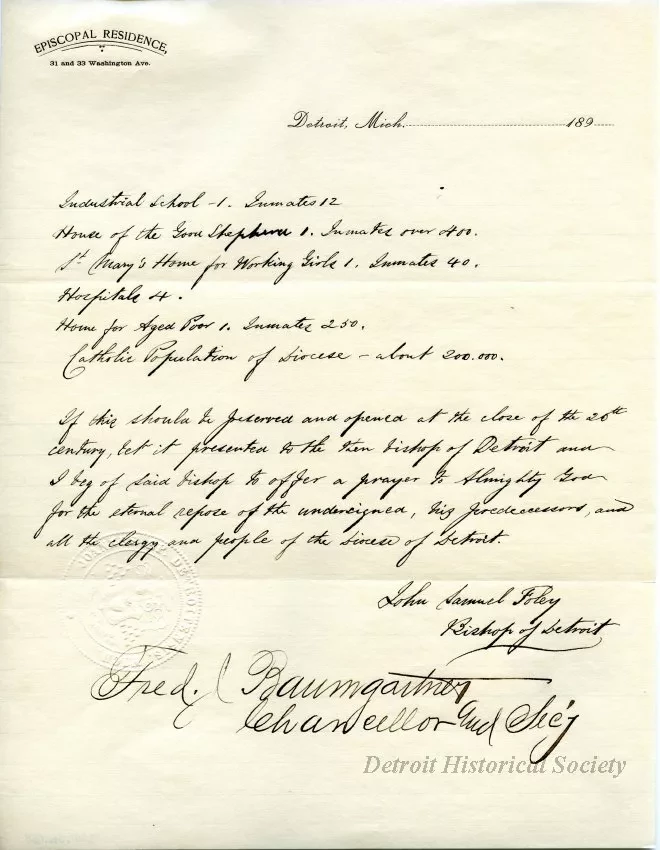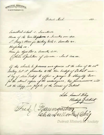 If this should be preserved and opened at the close of the 20th century, let it [be] presented to the then Bishop of Detroit and I beg of said bishop to offer a prayer to Almighty God for the eternal repose of the undersigned, his predecessors, and all the clergy and people of the diocese of Detroit.
