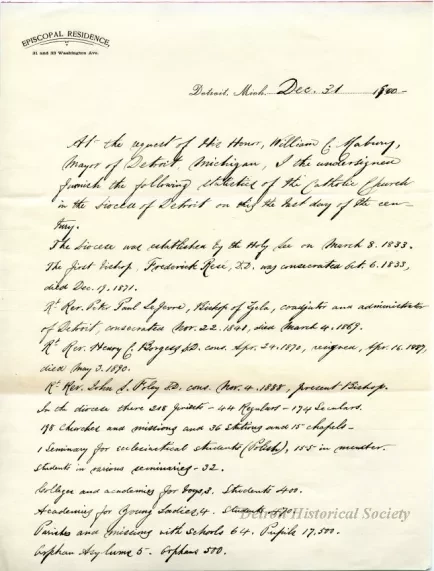 At the request of His Honor, William C. Maybury, Mayor of Detroit, Michigan, I the undersigned furnish the following statistics of the Catholic Church in the diocese of Detroit on this the last day of the century.