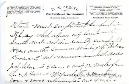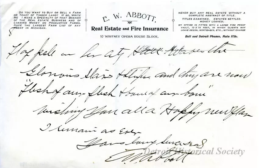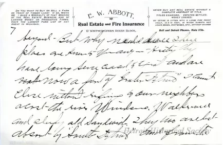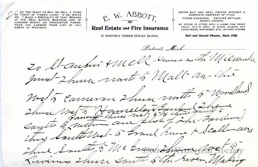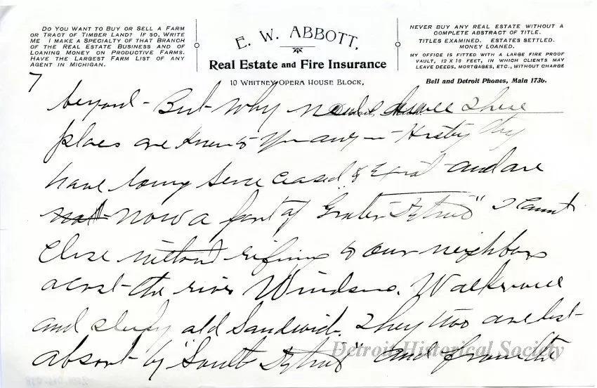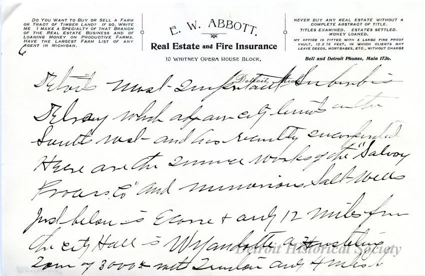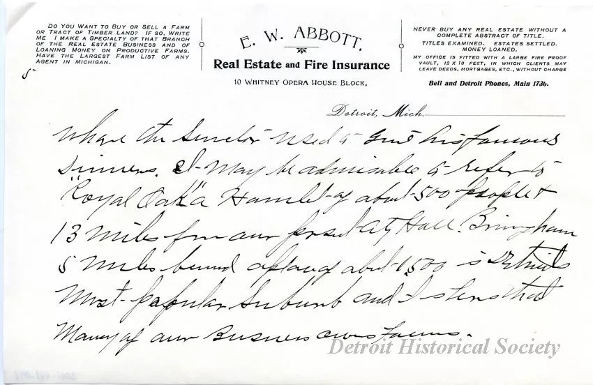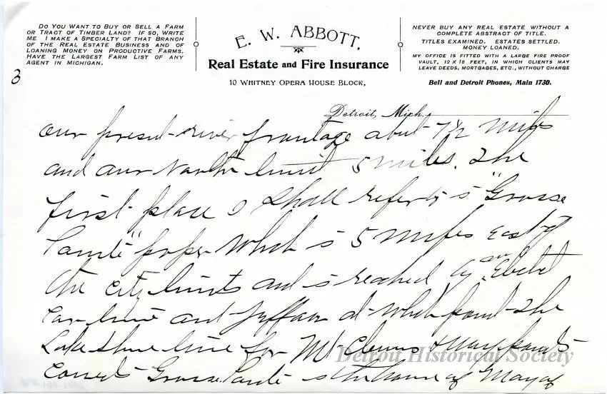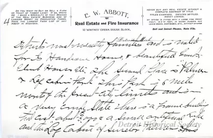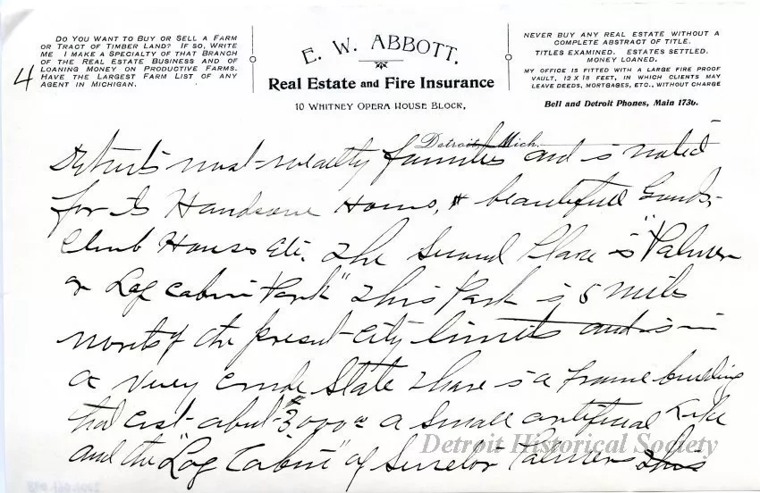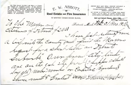 I have just returned home from a trip into the county and find the Mayor's request for a short letter on "Detroit's Suburbs." Our present City limits are on the east side present (I suppose I should say old) water-works or Cadillac Boulevard thence north to Gratiot Ave thence west to St. Antoine and MCRR [Michigan Central Railroad] known as the Milwaukee junction - thence west to Mall and thence west to Cameron thence north to Woodland thence west to Hamilton Boulevard thence south to within one block of the Boulevard thence southwest to Grand River and Scotten Ave. thence south to McGraw thence west to Livernois thence south to the river, making our present river frontage about 7 1/2 miles and our north limit 5 miles. The first place I shall refer to is "Grosse Pointe" proper which is 5 miles east of the city limits and is reached by an electric car line and Jefferson at which point the Lake Shore line for Mt. Clemens and many points connects. Grosse Pointe is the home of many of Detroit's most notable families and is noted for its handsome homes and beautiful Greek club houses etc. The second place is "Palmer Log Cabin Park." This park is 5 miles north of the present city limits and is in a very crude state. There is a frame building that cost about $3000.00, a small artificial lake and the "Log Cabin" of Senator Palmer where the Senator used to give his famous dinners. It may be advisable to refer to "Royal Oak," a hamlet of about 500 people, and 13 miles from our present City Hall. Birmingham 5 miles beyond, a place of about 1500, is Detroit's most popular suburb and is here that many of our businesses own farms. Detroit's most important suburb is Delray which adjoins city limits on the southwest and has recently expanded. Here are the ammonia works of the "Solvay Process" and voluminous salt wells. Just below is Ecorse and only 12 miles from the City Hall is Wyandotte a bustling town of 3000 and next Trenton only 4 miles beyond. But why need I dwell, these places are already known by you in history. They have long since ceased to exist and are now a part of "Greater Detroit." I cannot close without [?] our neighbors across the river, Windsor, Walkerville, and sleepy old Sandwich. They too are lost - absorbed by "Sault Detroit" [Windsor]. And from the flag pole on the City Hall waves the Glorious Stars and Stripes and they are now "flesh of our flesh and bone of our bone."