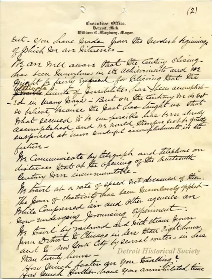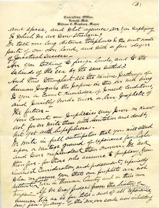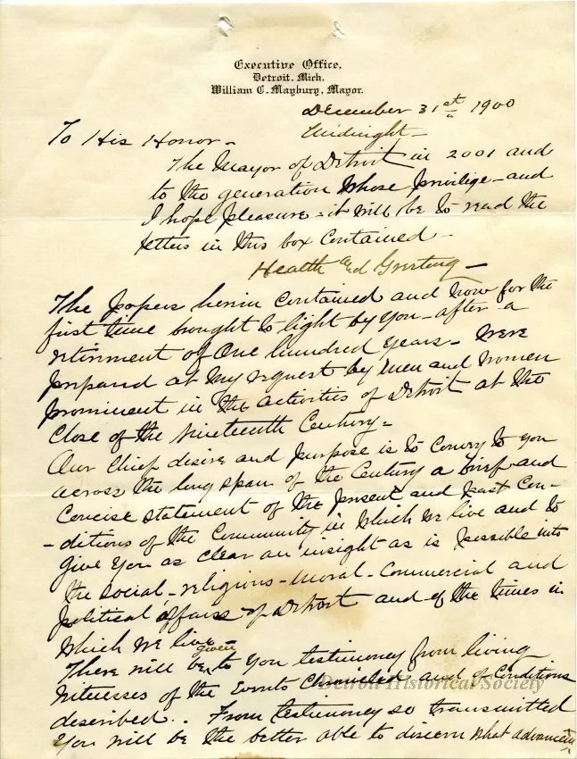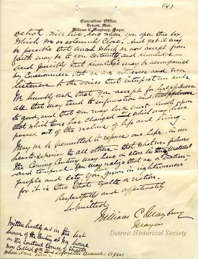 We write in full anticipation that you will stand upon a vantage ground of experience far higher and more resplendent than our own. We ask therefore, for those who assume to prophesy, your kindliest consideration, and judgment, especially when we assure you that our prophets are not without honor, even in their own Century and in their own times. If we may judge from the history of human life as so far told - and of all experience very few - if any - of the 300,000 souls now inhabiting Detroit - will live here when you open this box; which we so solemnly close. And yet it may be possible that such which we now accept from faith may be to you certainty and knowledge - and possibly that knowledge may be accompanied by consciousness that we are witnesses and even listeners to the voices that interpret our words.