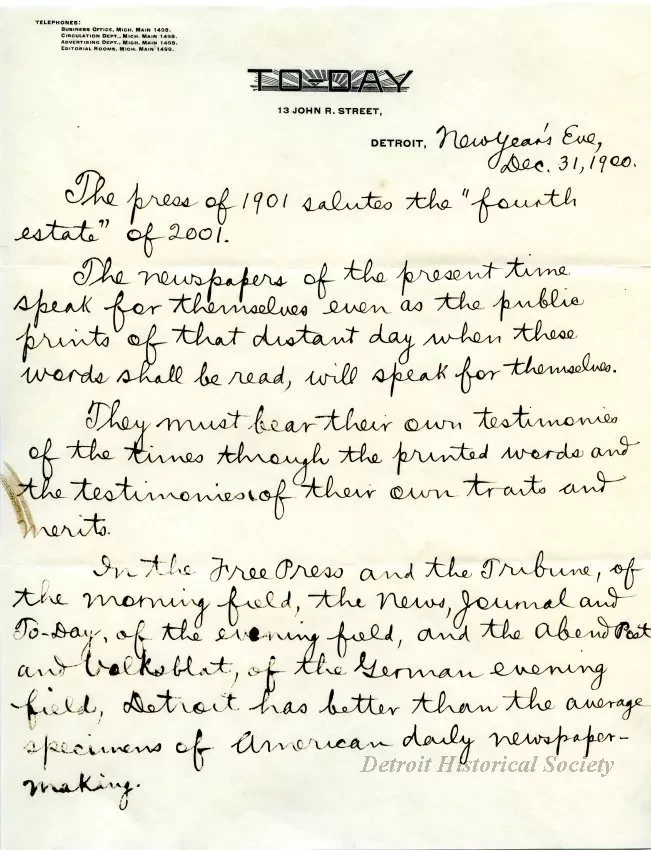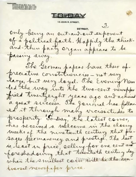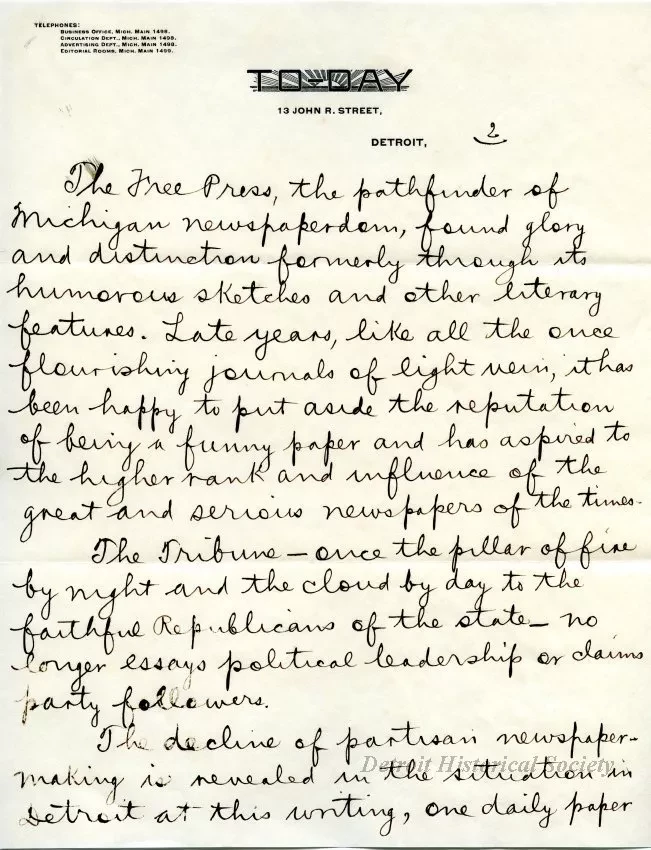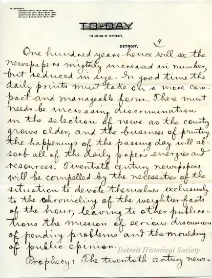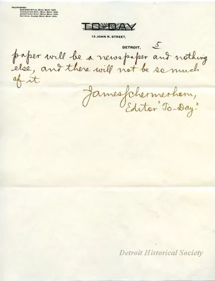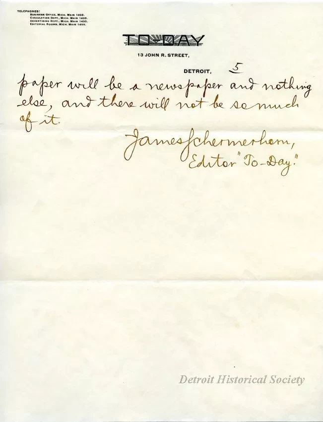 This 5-page letter was handwritten in black ink on slightly yellowed paper by James Schermerhorn who was the Editor of the TO-DAY newspaper. The newspaper letterhead is printed in black text at the top and each page and has the watermark, "Persian Bond." The text of the letter has been transcribed as follows: