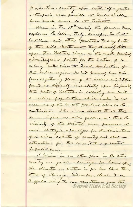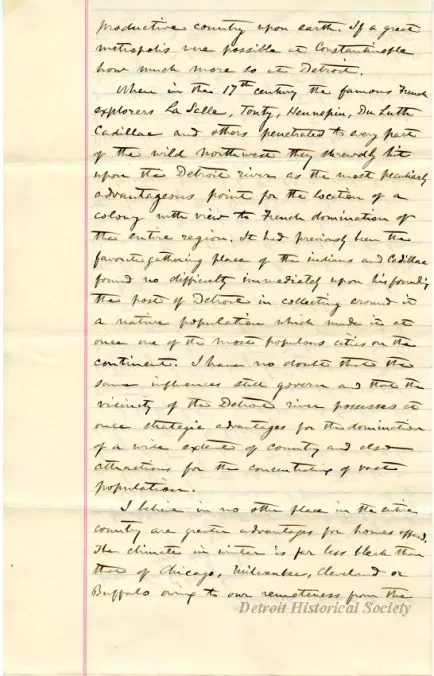 When in the 17th century the famous French explorers LaSalle, Tonty, Hennepin, DuLuth, Cadillac and others penetrated to every part of the wild northwest they shrewdly hit upon the Detroit River as the most peculiarly advantageous point for the location of a colony with view to French domination of the entire region. It had previously been the favorite gathering place of the indians and Cadillac found no difficulty immediately upon his founding the post of Detroit in collecting around it a native population which made it at once one of the most populous cities on the continent. I have no doubt that the same influences still govern and that the vicinity of the Detroit River possesses at once strategic advantages for the domination of a wide extent of country and also attractions for the concentrating of vast population.