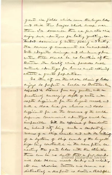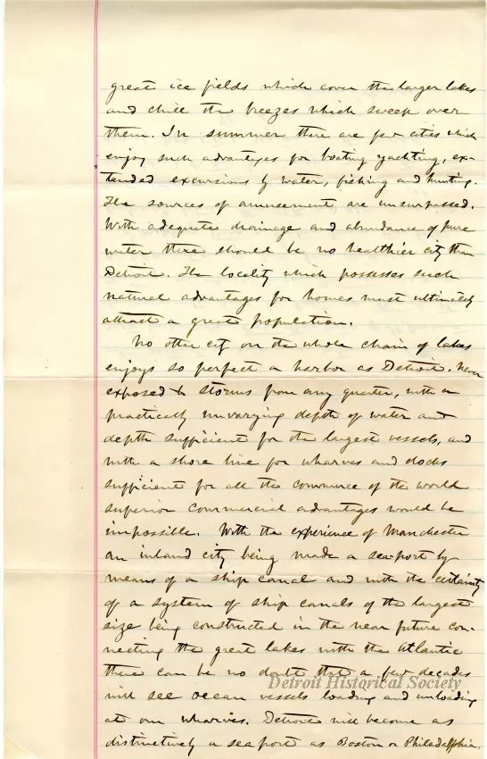 No other city on the whole chain of lakes enjoys so perfect a harbor as Detroit. Never exposed to storms from any quarter, with a practically unvarying depth of water and depth sufficient for the largest vessels, and with a shore line for wharves and docks sufficient for all the commerce of the world superior commercial advantages would be possible. With the experience of Manchester an inland city being made a sea-port by means of a ship canal and with the certainty of a system of ship canals of the largest size being constructed in the near future connecting the great lakes with the Atlantic there can be no doubt that a few decades will see ocean vessels loading and unloading at our wharves. Detroit will become as distinctively a seaport as Boston or Philadelphia.