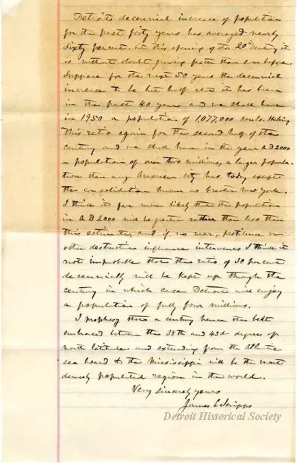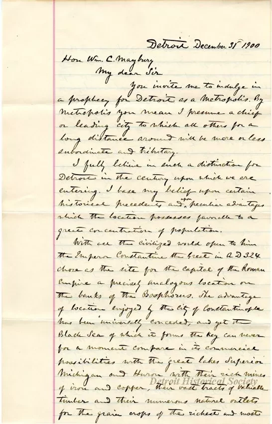 You invited me to indulge in a prophecy for Detroit as a Metropolis. By metropolis you mean I presume a chief or leading city to which all others for a long distance around will be more or less subordinate and tributary.