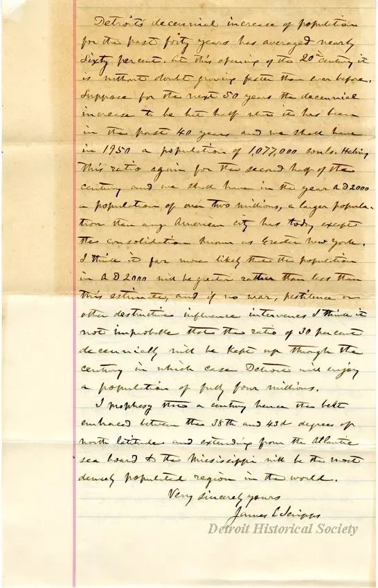 Detroit's decennial increase of population for the past forty years has averaged nearly sixty per cent. At this opening of the 20th Century it is without doubt growing faster than ever before. Suppose for the next 50 years the decennial increase to be but half what is has been in the past 40 years and we shall have in 1950 a population of 1,077,000 souls. Halving this ration again for the second half of the century and we shall have in the year AD 2000 a population of over two millions, a larger population than any American city has today except the consolidation known as Greater New York. I think it far more likely that the population of AD 2000 will be greater rather than less than this estimate, and if no war, pestilence, or other destructive influence intervenes I think it not improbable that the ration of 30 percent decennially will be kept up through the century in which case Detroit will enjoy a population of fully four millions.