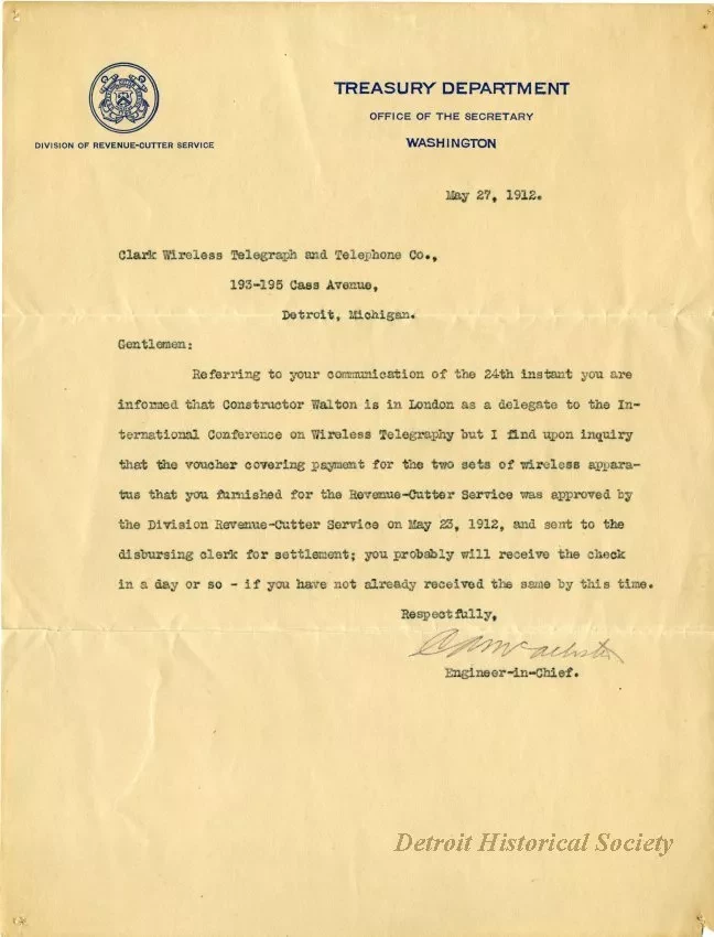 Typewritten letter from C.A. McAllister, the engineer-in-chief of the Treasury Department's Division of Revenue-Cutter Service to the Clark Wireless Telegraph and Telephone Company at 193-195 Cass Avenue, dated May 27, 1912, concerning both Revenue-Cutter Service Constructor John Q, Walton's role as a delegate to the International Conference on Wireless Telegraphy, and a check for two sets of wireless equipment, which is in the mail. The letter closes with McAllister's signature. The letter is printed on Revenue-Cutter Service letterhead.