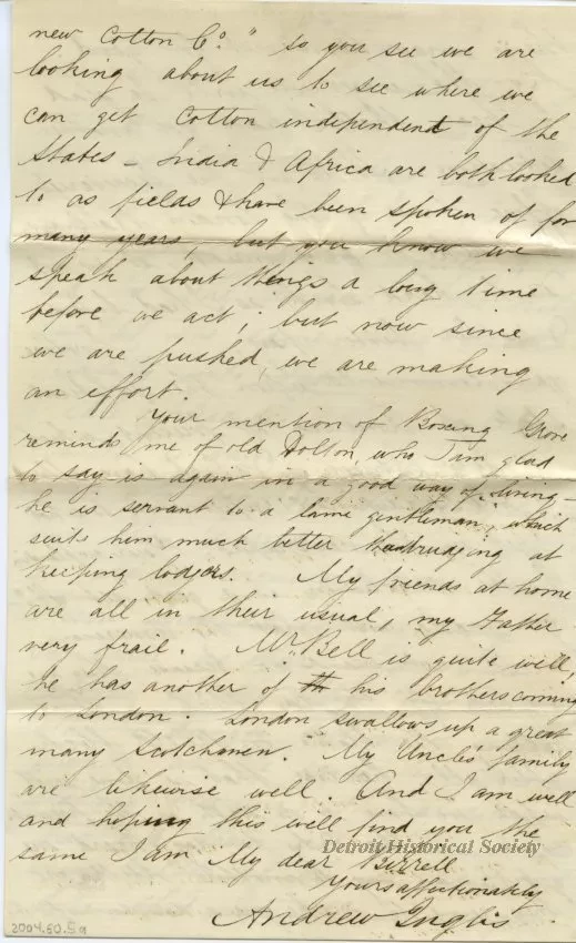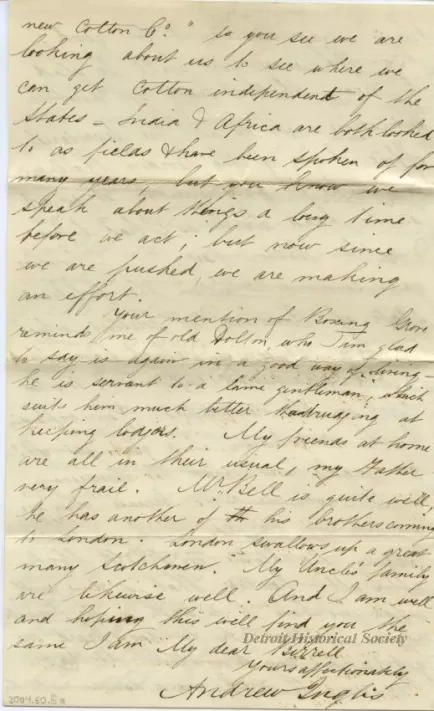 I notice your comments upon the political state of America at present, which are very interesting & which have afforded me additional information to what I get in the newspapers. Your explanation of the revolution is a good "get off"- you make out that the Americans could not stand [ ], because they are a chip off the old block- Thus rolling the blame on the old block after all; however that is done with, what we have to do with is the present. I was in the City today & heard one gentleman say to another "Well are they going to make you a director of the new Cotton Co." so you see we are looking about us to see where we can get cotton independent of the States- India & Africa are both looked to as fields & have been spoken of for many years, but you know we speak about things a long time before we act; but now since we are pushed, we are making an effort.