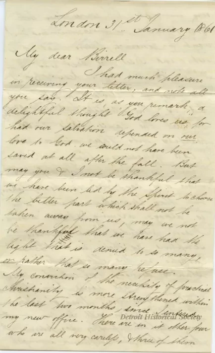 I had much pleasure in receiving your letter, and note[?] all you say. It is, as you remark, a delightful thought "God loves us," for had our salvation depended on our love to God we could and have been saved as all after the fall. But may you and I not be thankful that we have been led by the Spririt to choose the better part which shall not be taken away from us, may we not be thankful that we have had the light that is denied to so many, or rather you so many refuse.