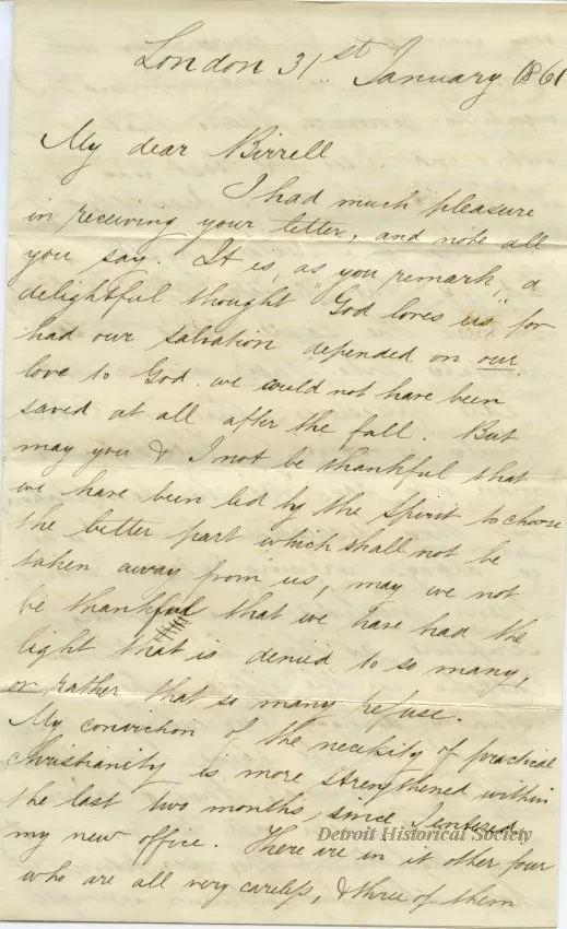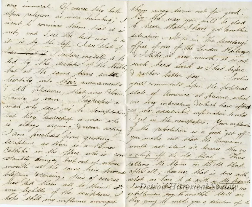 My conviction of the necessity of f[ .] Christianity is more strengthened within the last two months since I entered my new office. There are in it other four who are all very [ ], & three of them very immoral. Of course they look upon religion as mere humbug; I want to convince them that it is not, and I see the best way to do it is by the life. I see that if I declare myself to be led by the dictates of the Birth, but at the same time enter heartily into their amusements & idle pleasures, that my Christianity is vain. They respect a man who says 'no' to temptation, but they disrespect a man who is always arguing & never acting. I am precluded from quoting scripture as their [sic] is a Roman Catholic in the office who is constantly doing so, but out of whose mouth at the same time proceeds blessing & cursing; this of course has led them all to think very lightly[?] of the scripture. I hope that my influence amongst them turn[?] out for good. By-the-way you will be glad to hear that I have got another situation. It is in the Secretary's office of one of the London Railways, & I like it very much, it is not such hard work as I had before & rather better pay.
