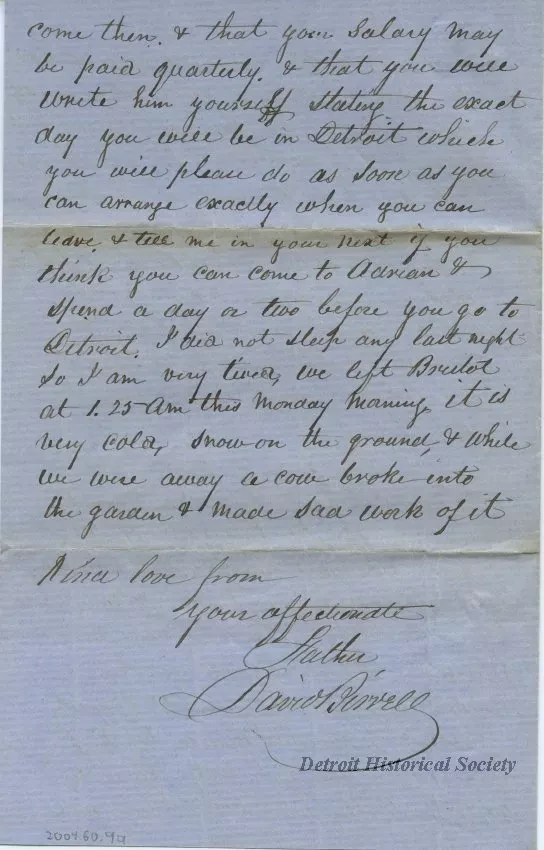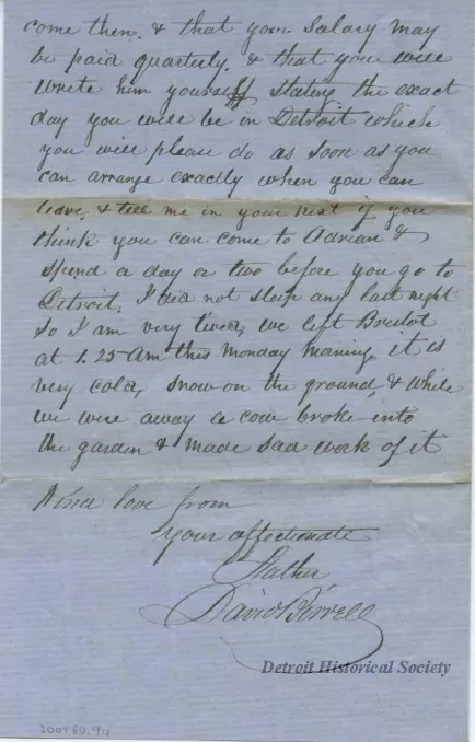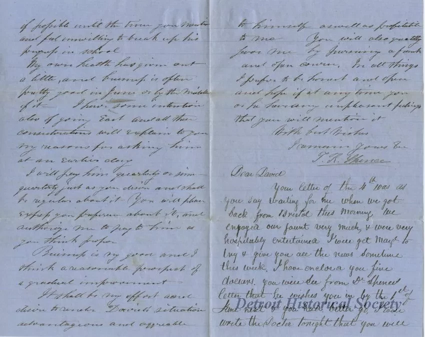 Your letter of the 4th was as you say waiting for me when we got back from Bristol this morning. We enjoyed our jaunt very much, & were very hospitably entertained. I will get Marge to Ivy & give you all the news sometime this week. I have enclosed you five dollars. You will see from Dr Spence's letter that he wishes you in by the 1st of June next & you had better go, I will write the Doctor tonight that you will come then & that your salary may be paid quarterly, & that you will write him yourself stating the exact day you will be in Detroit which you will please do as soon as you can arrange exactly when you can leave, & tell me in your next if you think you can come to Adrian & spend a day or two before you go to Detroit. I did not sleep any last night so I am very tired, we left Bristol at 1:25 AM this Monday morning. It is very cold, snow on the ground, & while we were away a cow broke into the garden & made sad work of it.
