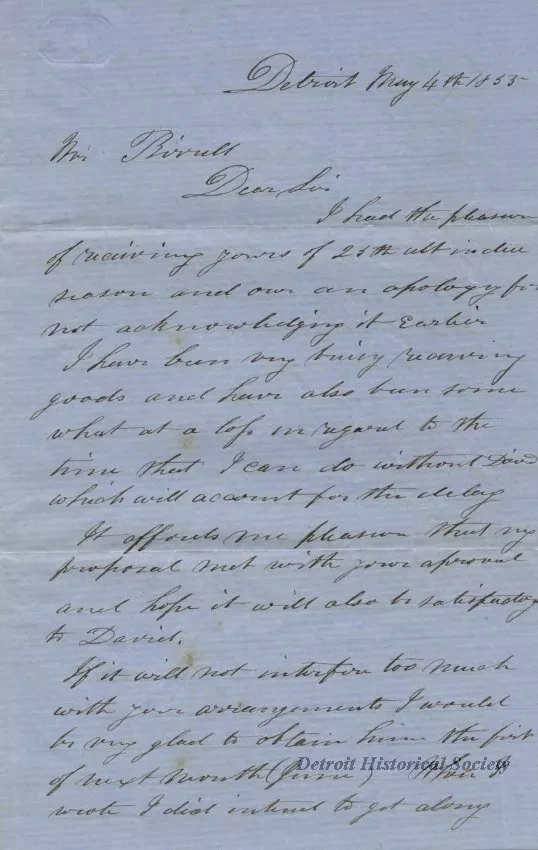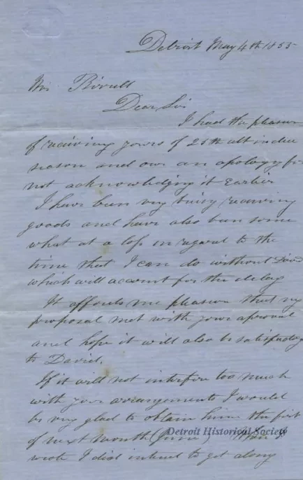 It shall be my effort and desire to render David's situation advantageous and agreeable to himself as well as profitable to me. You will also greatly favor me by pursuing a [?] and open course. In all things I prefer to be honest and open and hope if at any time you or he have any unpleasant feelings that you will mention it.
