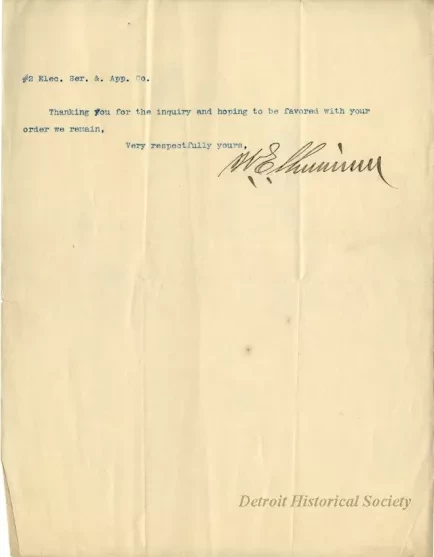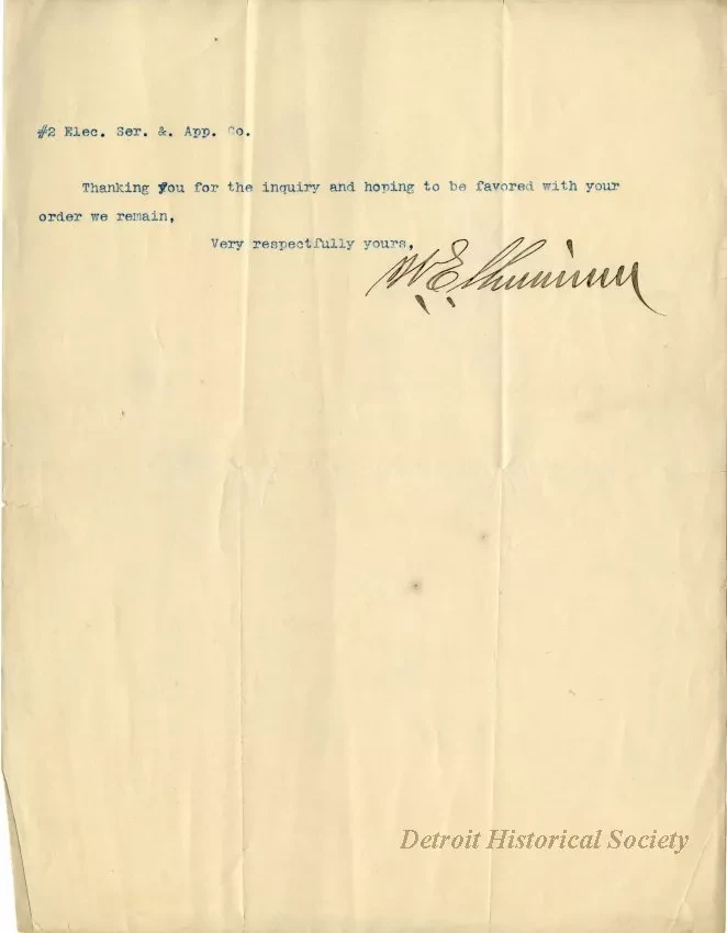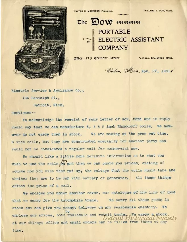 Two page typewritten letter from Walter E. Morrison, president of the Dow Portable Electric Assistant Company of Braintree, Massachusetts to the Electric Service and Appliance Company on 166 Randolph Street, dated November 27, 1901, written in reply to a previous letter from the company. Morrison responds that they do not generally carry three, four, or five inch Rhumkorff coils, however they can specially manufacture them given some further information about what voltage it will carry and whether they will be run by battery or generator. Morrison adds that they have enclosed a catalogue of automotive goods as well. Morrison closes with his signature. The first page is printed on Dow Portable Electric Assistant Company letterhead, which includes an engraving of a portable receiver built into a carrying case.