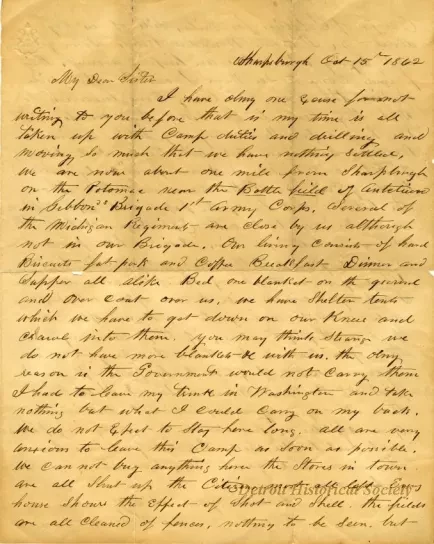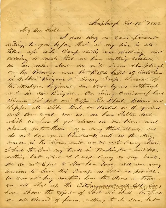 Letter reads, "My Dear Sister, I have only one excuse for not writing to you before that in my time is all taken up with Camp duties, and drilling and moving so much that we have noting settled. We are now about one mile from Sharp burgh on the Potomac near the Battle field of Antietam in Gibbon's Brigade, 1st Army Corps. Several of the Michigan regiments are close by us although not in our Brigade. Our living consists of hard biscuits, fat pork, and coffee. Breakfast, Dinner and Supper all alike. Bed one blanket on the ground and over coat over us, we have shelter tents which we have to get down on our knees and crawl into them. You may think strange we do not have more blankets with us. The only reason is the Government would not carry them. I had to leave my trunk in Washington and take nothing but what I could carry on by back. We do not expect to stay here long. All are very anxious to leave this camp as soon as possible. We cannot buy anything here. The stores in town are all shut up, the citizens most all left. Every house shows the effect of shot and shell. The fields are all cleaned of fences, nothing to be seen, but camps of soldiers for miles. Sight of us lays about - One house and wounded Rebels, some groaning and dying, while others are limping around. Their friends come to see them from the other side of the river and bring them luxuries, so that they seem to live better than we do. We have a fire show every day which consists of Balloon ascension that with the constant blowing of Fifes and beating of drums from, 'early morn to dewy eve' in all the amusements that is on the fields. I see by the paper that Capt. William is on the new boat with Capt. Vigen, I hope the change is better for him. I red a letter from home a days ago, Father did not like it because I had gone in the army. The folks were all well I wish you would write to me often whether I write or not and go to my house often and see and see how they get along if they need anything that you can do for them I hope you will accommodate. I expect to be paid off on the first of the next month when I shall send them money. Give my respects to William and your children. Remember to me all enquiring friends. Don't fail to see Betty, tell her you have heard from me and give her my love, I wrote her a few days ago. I remain your brother, A. W. Sprague."