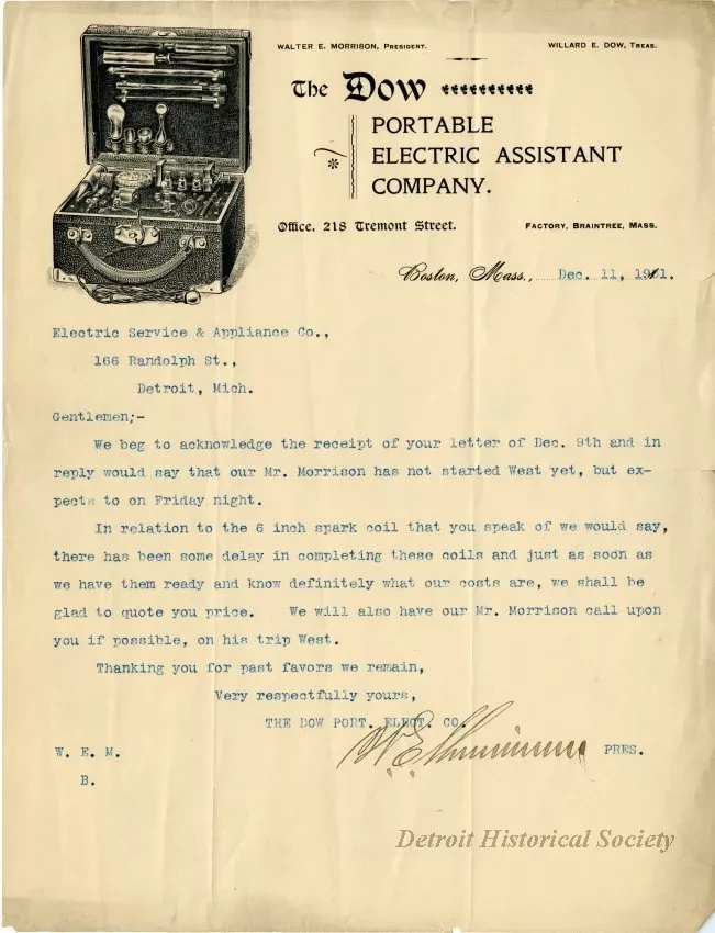 Typewritten letter from Walter E. Morrison, president of the Dow Portable Electric Assistant Company of Braintree, Massachusetts to the Electric Service and Appliance Company on 166 Randolph Street, dated December 11, 1901, written in reply to a previous letter from the company. Morrison, or someone writing on his behalf states that "our Mr. Morrison" will be leaving on a trip on Friday, but he will call from his trip if possible. Additionally the letter says that there has been a delay in the manufacturing of the six inch park coils which the Electric Service and Appliance Company has ordered. Morrison's signature closes the letter. It is printed on Dow Portable Electric Assistant Company letterhead, which includes an engraving of a portable receiver built into a carrying case.