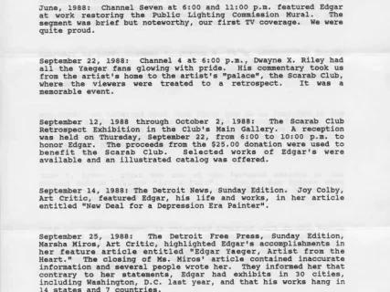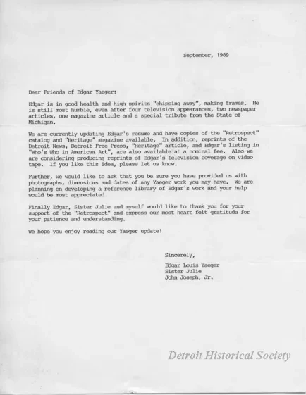 Typewritten letter from Edgar Louis Yaeger, Sister Juliette Shaheen, and John Joseph, Jr. addressed to "Friends of Edgar Yaeger," updating them on his health and recent appearances in the media, as well as reminding them to provide information on Yaeger's work such as photographs, dimensions and dates. The letter also expresses gratitude for the support of Yaeger's "Retrospective" exhibit at the Scarab Club.
