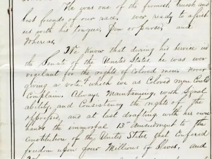 Handwritten letter from the Colored Citizens of Detroit sent to the family of Jacob Merritt Howard, upon the occasion of Howard's death to accompany a copy of resolutions adopted in memorial of the late senator (2013.048.672). The letter reads: