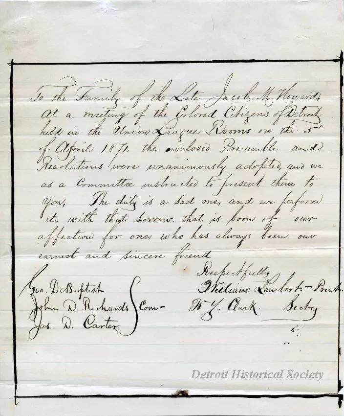 To the family of the late Jacob M. Howard, at a meeting of the Colored Citizens of Detroit held in the Union League Rooms on the 5th of April 1871, the inclosed Pre-amble and Resolutions were unanimously adopted, and we as a Committee instructed to present them to you, The duty is a sad one, and we perform it, with that sorrow, that is born of our affection for one, who has always been our earnest and sincere friend.