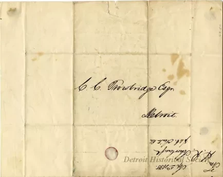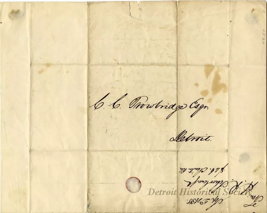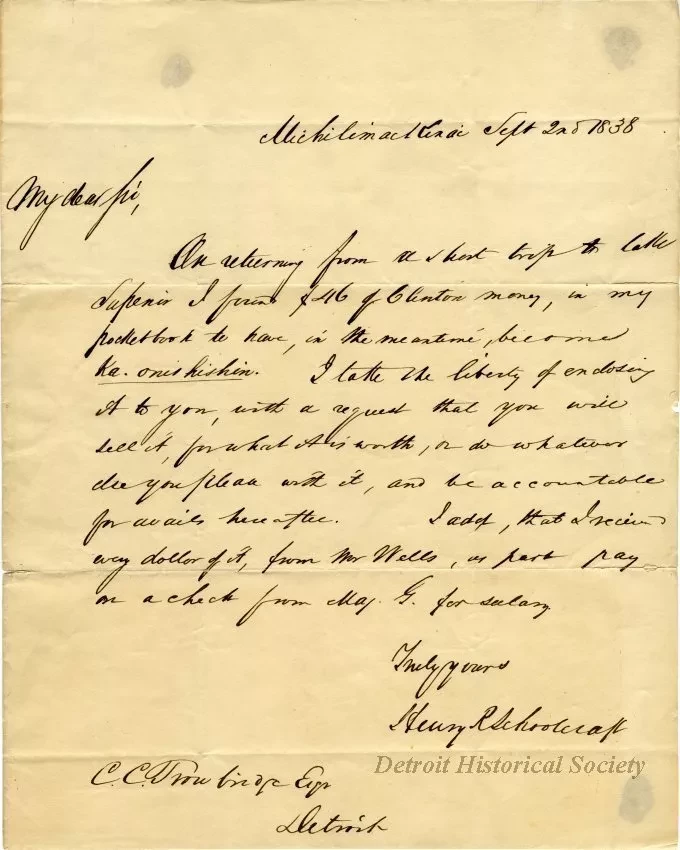 Handwritten letter from Henry Schoolcraft of 846 Clinton Boulevard, Michilimackinac to Charles Christopher Trowbridge of Detroit, dated September 2, 1838, sent accompanying devalued money from the wildcat bank, Bank of Clinton. Schoolcraft uses the Ojibwe words, "Ka. onishishin," to describe the currency. "Ka" means "no," and Schoolcraft, in his book, "The American Indians: Their History, Condition and Prospects, From Original Notes and Manuscripts," defines "onishishin" as "that which is good, or fair." The letter reads: