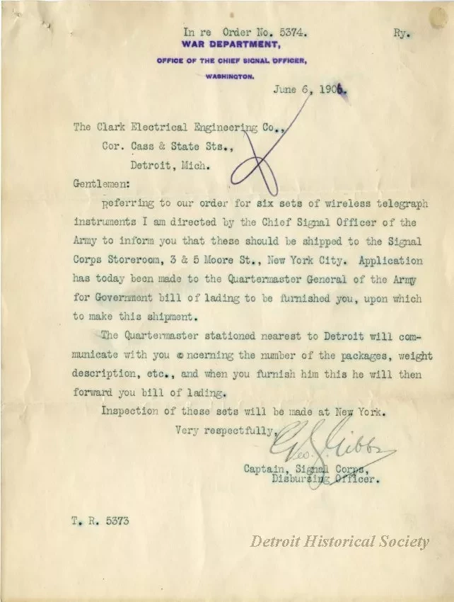 Typewritten letter sent to the Clark Electrical Engineering Company from Captain George Sabin Gibbs, of the Signal Corps on June 6, 1906. The message is in regard to order no. 5374 for "six sets of wireless telegraph instruments." Gibbs instructs that the sets should be shipped to the Signal Corps Storeroom in New York City. He adds that the army Quartermaster nearest to Detroit will follow up with specifications regarding shipping. Gibbs closes with his signature. The letter is printed on War Department, Office of the Chief Signal Officer letterhead.