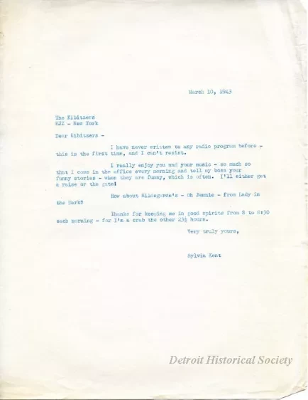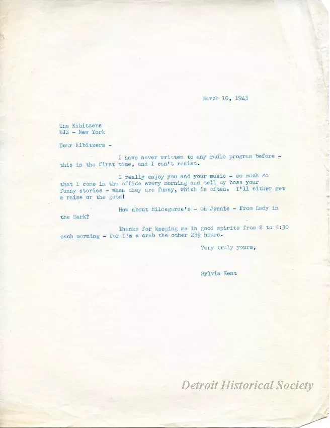 One letter typewritten in blue ink, dated March 10, 1943, addressed from Sylvia Kent to The Kibitzers. The letter notes that Kent has never written to a radio program before but she felt she must because she enjoys the Kibitzers so much. She notes that she repeats jokes to her boss and thanks them for keeping her in good spirits for at least one half hour each day.