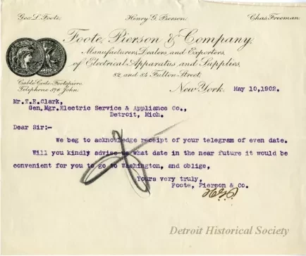 Typewritten letter from Foote, Pierson and Company of New York to Thomas E. Clark, the general manager of Electric Service and Appliance Company, dated May 10, 1902. It contains a brief message asking when Clark would be able to go to Washington. It is printed on Foote, Pierson and Company letterhead. An illegible signature or set of initials is just below the closing.