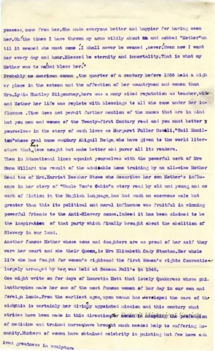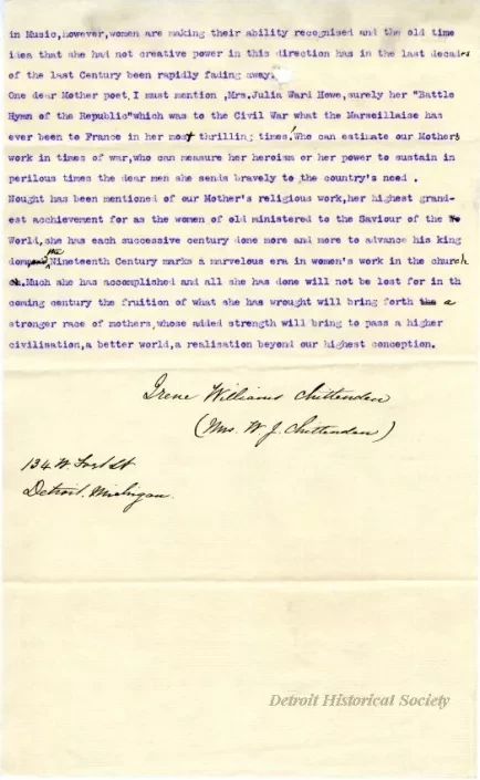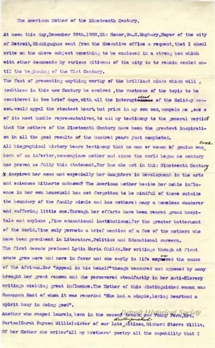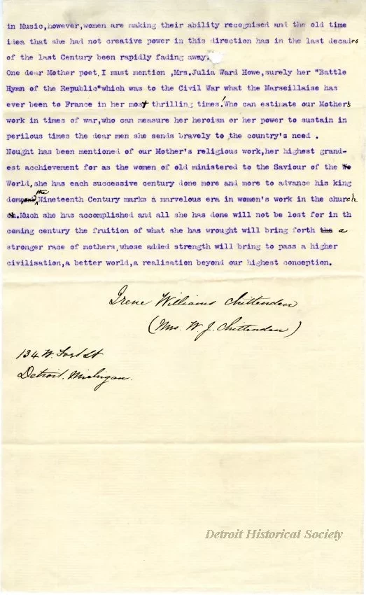 This 3-page letter is entitled "The American Mother of the Nineteenth Century." It is printed in typewritten text that has been mimeographed onto a thin linen paper that has the watermark, "Invincible." The body of the letter gives a brief discussion of women in the home and then mentions the contributions of famous women such as Lydia Maria Childs, Harriet Beecher Stowe, Elizabeth Cady Stanton, Lucretia Mott, Julia Ward Howe, and others. The letter is signed on the third page, "Irene Williams Chittenden (Mrs. W. J. Chittenden), 134 W. Fort St., Detroit, Michigan." There are numerous corrections that have been handwritten in black ink throughout the letter.