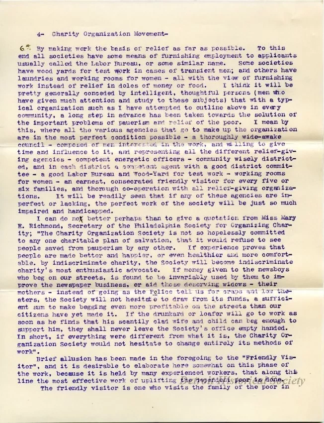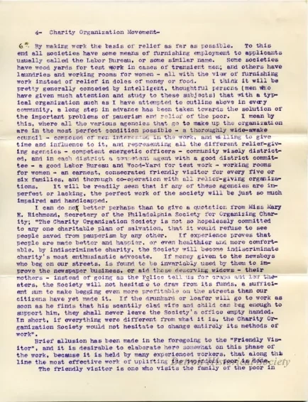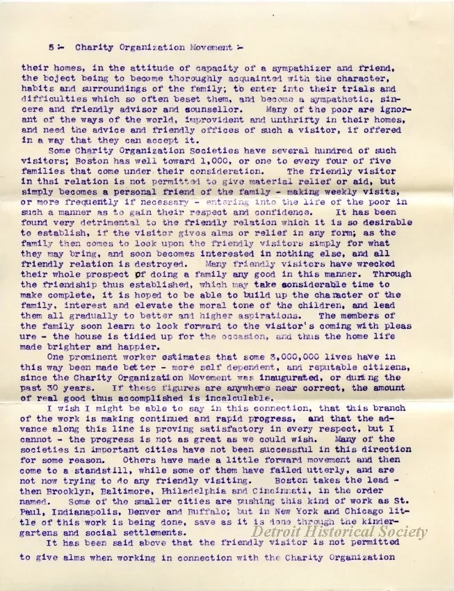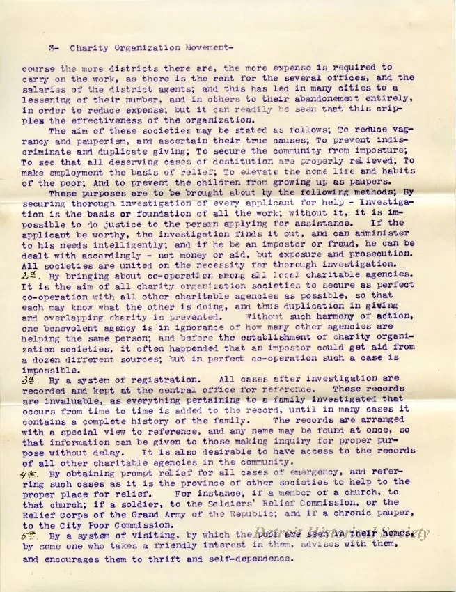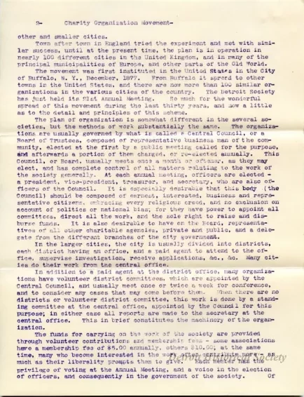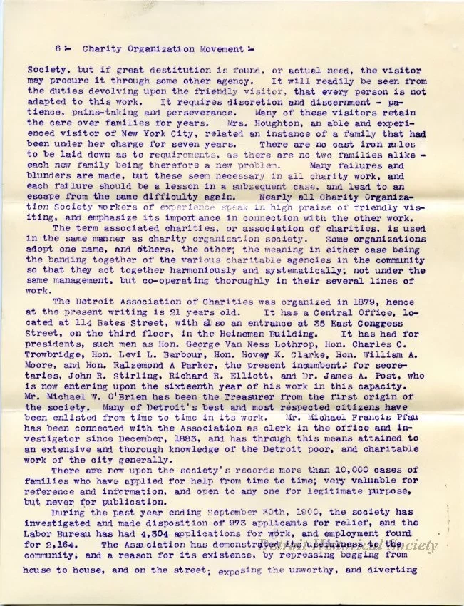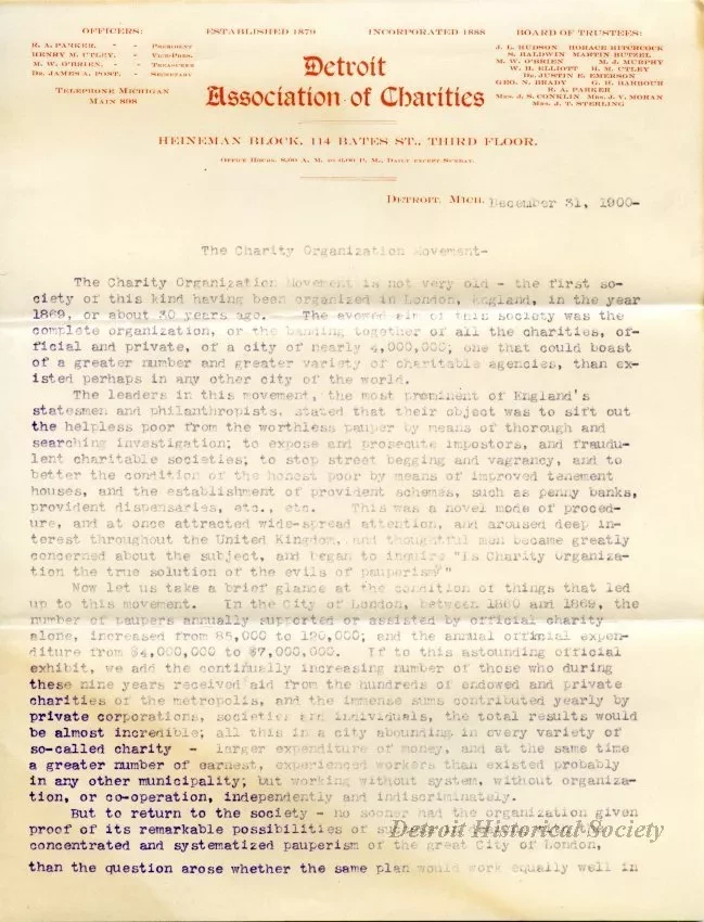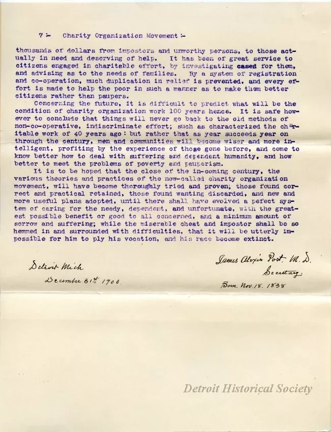 Letter from the Detroit Association of Charities. The cover page shows the letterhead of the organization which is printed in red text on slightly yellowed paper. The names of the officers of the organization are shown in the upper left corner: "R. A. Parker, President; Henry M. Utley, Vice-President; M. W. O'Brien, Treasurer; Dr. James A. Post, Secretary." The body of the 7-page letter is printed in typewritten text that has been mimeographed in a purple color onto the letter pages. The letter is dated December 31, 1900, near the upper right corner area on the first page and the last page has been signed and dated in black ink by "James Alexis Post, M.D., Secretary" who also noted that he was "Born Nov. 18, 1838." The letter gives a general discussion of charity movements in England and the United States as well as some background and details of the Detroit Association of Charities.