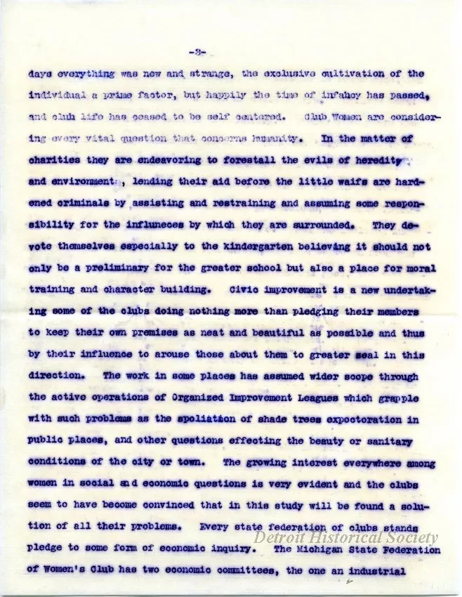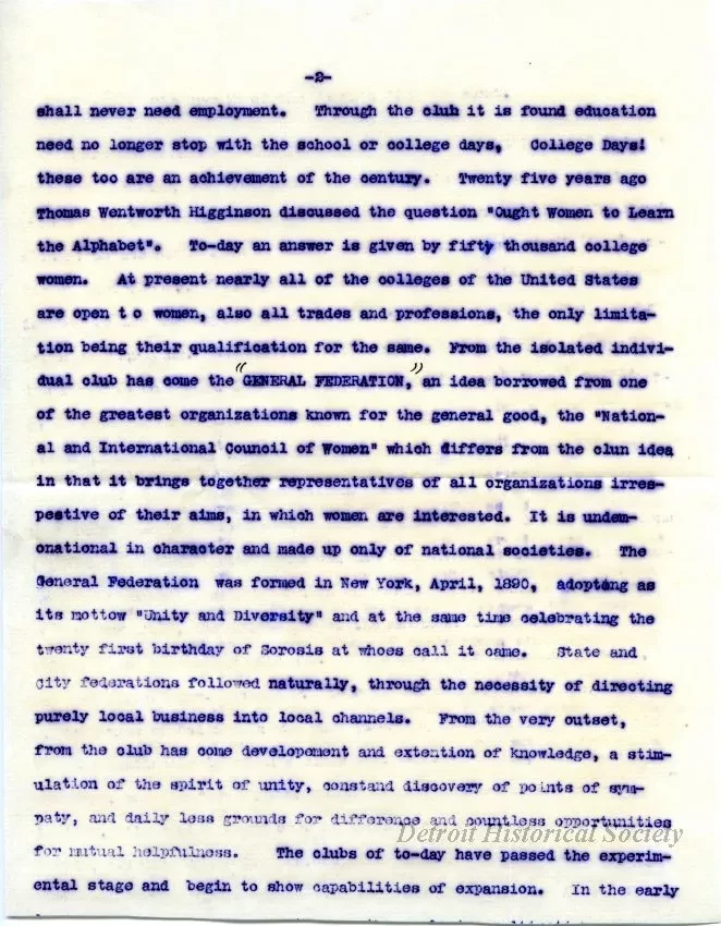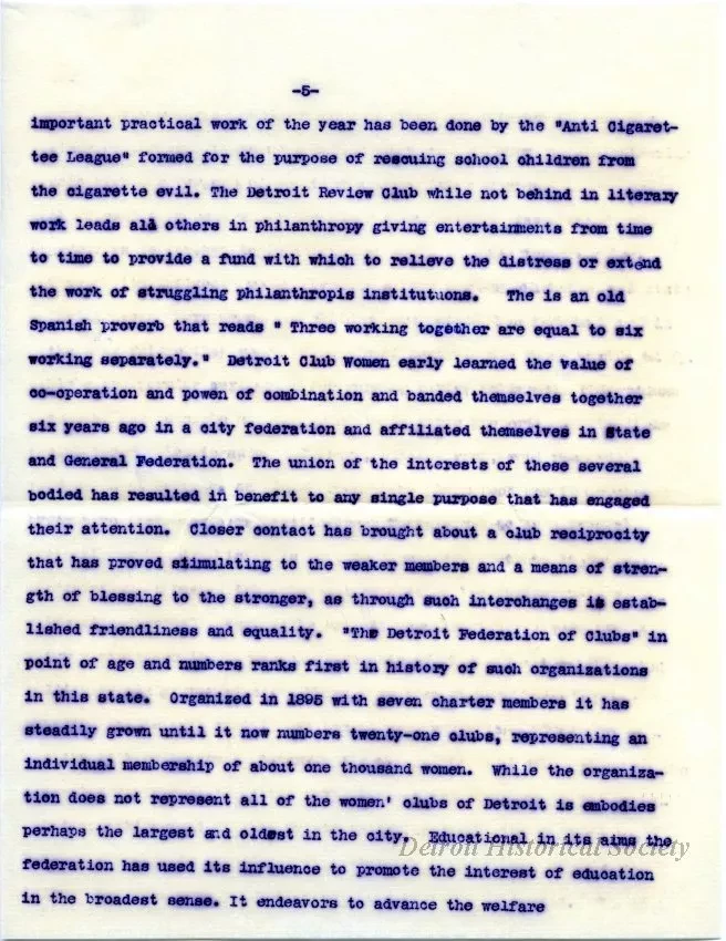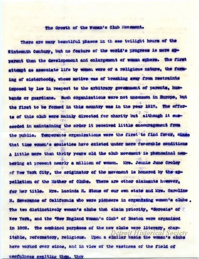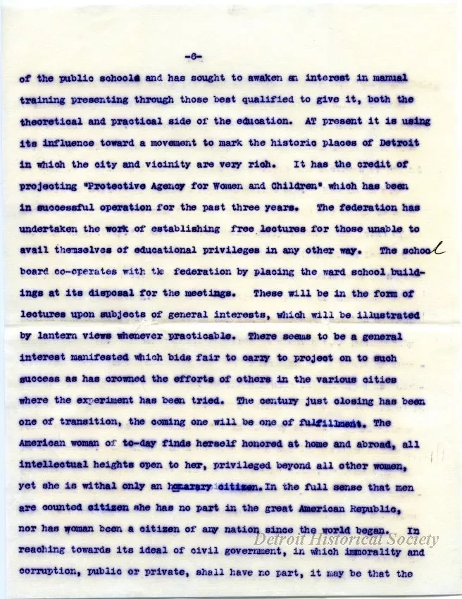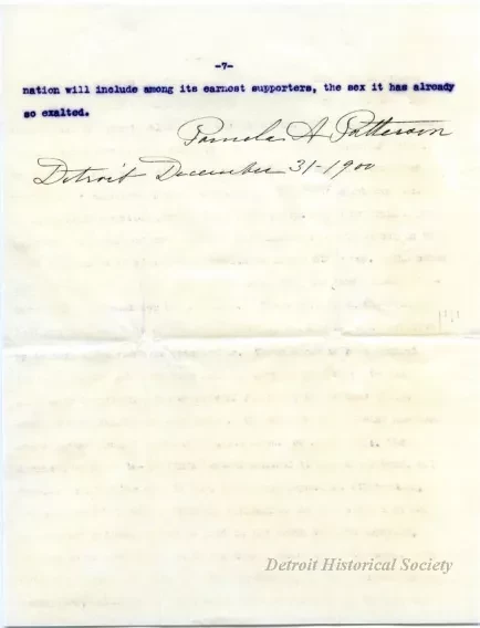 7-page letter written by Pamela A. Patterson. It is a blue carbon copy which was typewritten onto slightly yellowed, thin linen paper. The last page is signed in black ink, "Pamela A. Patterson" and is dated December 31, 1900.