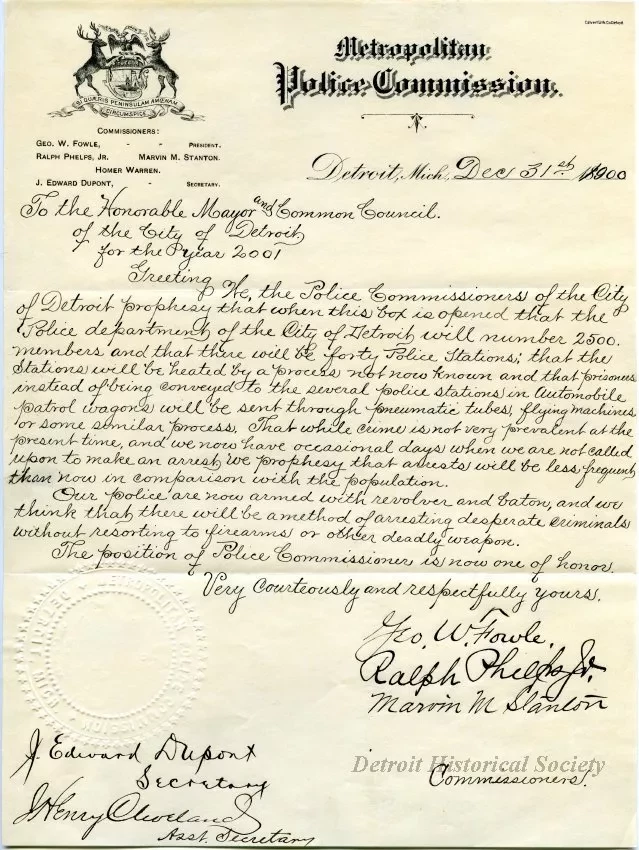 We, the Police Commissioners of the City of Detroit prophesy that when this box is opened that the Police department of the City of Detroit will number 2500 members and that there will be forty Police Stations; that the stations will be heated by a process not now known and that prisoners instead of being conveyed to the several police stations in Automobile patrol wagons will be sent through pneumatic tubes, flying machines, or some similar process. That while crime is not very prevalent at the present time, and we now have occasional days when we are not called upon to make an arrest. We prophesy that arrests will be less frequent than now in comparison with the population.
